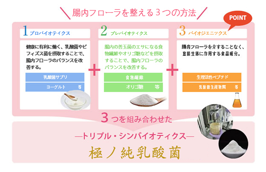 「極ノ純乳酸菌」は、国産の有機大豆を原料に、厳選した[21種類]の乳酸菌ビフィズス菌が共棲発酵により作り出した[523種類]もの成分を含有した「トリプル・シンバイオティクス」を原料とした製品です。
