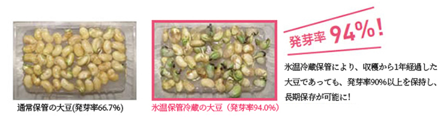 大豆は自然現象として収穫後からの劣化(参加を含む)の進行が早く、品質上、常に安定した発酵成分ができず、微生物のエサ(培地)として不向きと言われていました。そこで、弊社では大豆品質を長時間保ち、常に安定した培地で製造を行うため、「氷温冷蔵」による大豆保管を徹底しております。